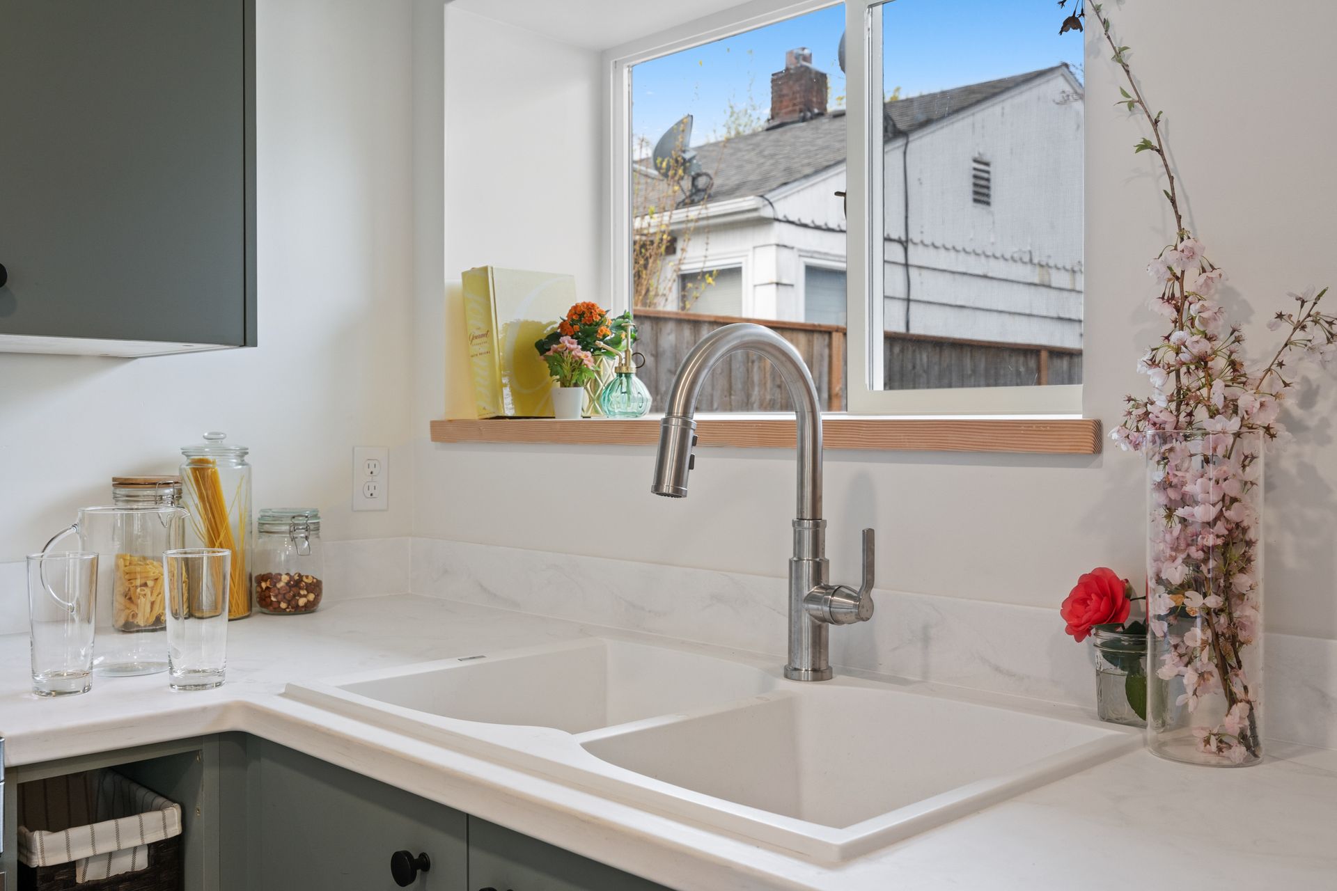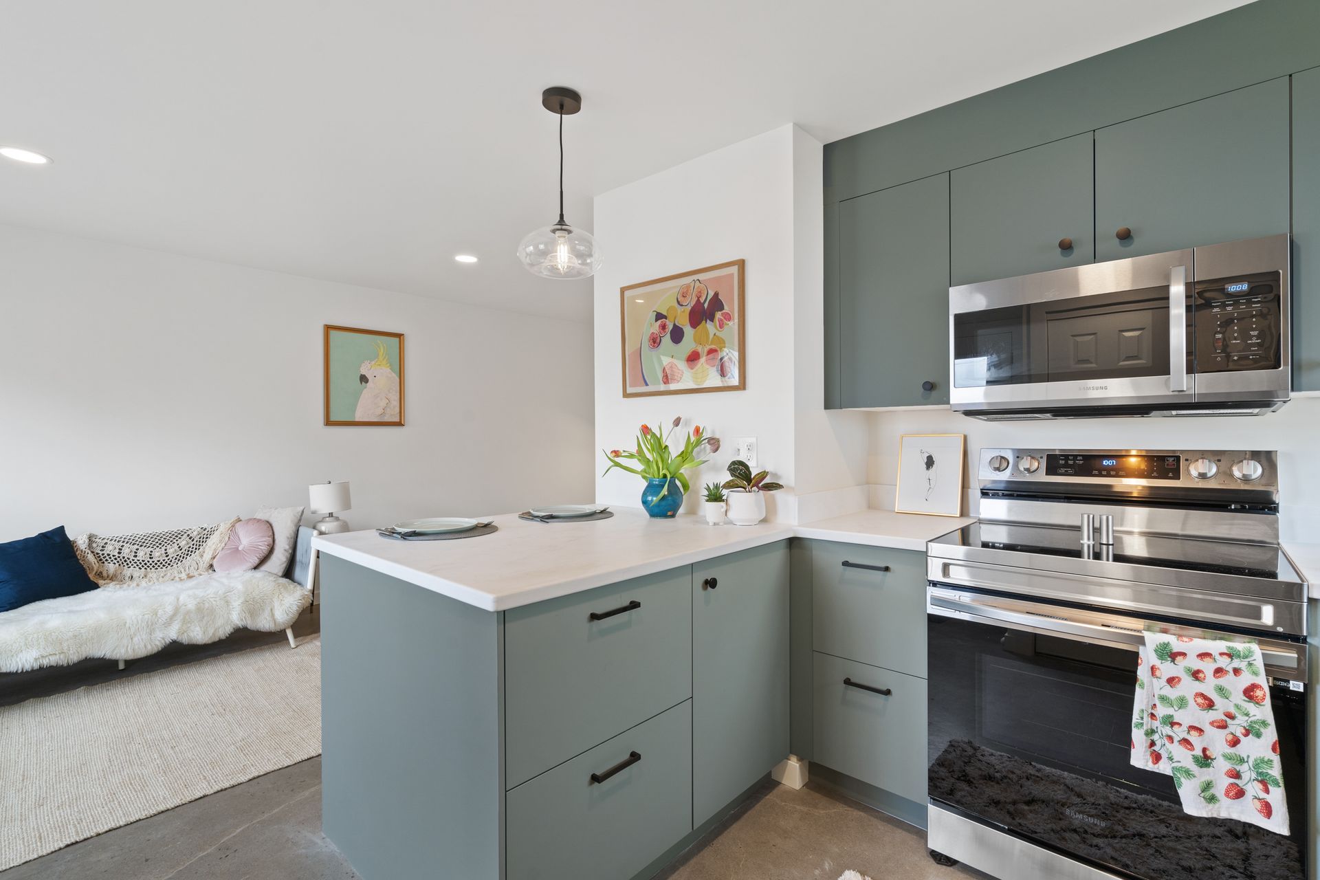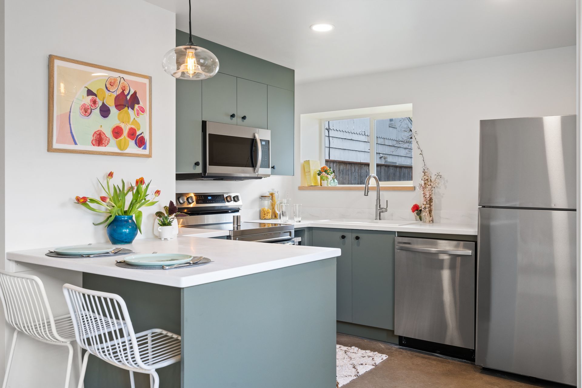 This accessory dwelling unit kitchen was designed to feel both architectural and inviting. A deep teal palette anchors the space, paired with clean lines, natural light, and thoughtful material contrasts. The result is a compact kitchen that feels intentional and elevated—balancing bold color with simplicity and function.